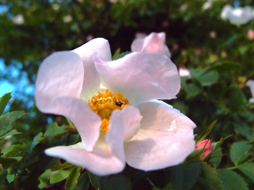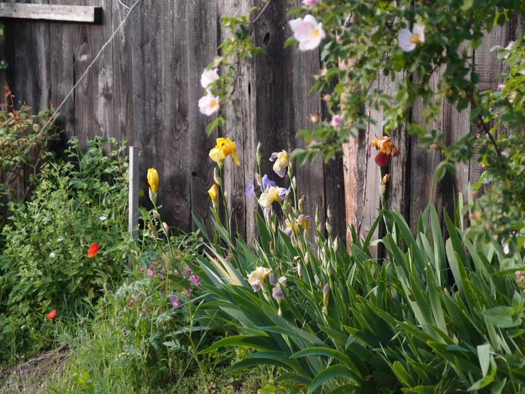 Und ich mag den Garten, auch den, der vor dem Zaun langsam entstanden ist. Mal bekam ich diese Pflanze geschenkt, ein paar Iris die weg sollten, Storchelschnabel von Silvia. Die Rosen habe ich genau gewählt, gelbe Ramblerrosen aus dem Kathalog, ein bissl Bennessl, Mutterkraut, Hauswurz auf dem Blechdach und wilde Rosen. Da gehe ich extra manchmal drumherum.