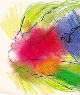 Ich flutsche raus. Werde aufgefangen, in ein blaues Tuch eingehüllt, gehalten, zur Brust genommen. Ahne die Farben Blau und Gold, etwas Lila und Kupfer. Meine spirituellen Eltern sind da. Ich wachse, bin Kind. Sitze zwischen Mutter und Vater. Bin beschützt, geliebt und gefördert. Werde Erwachsen. Sehe viele Farbkaskaden, Farbmuster.