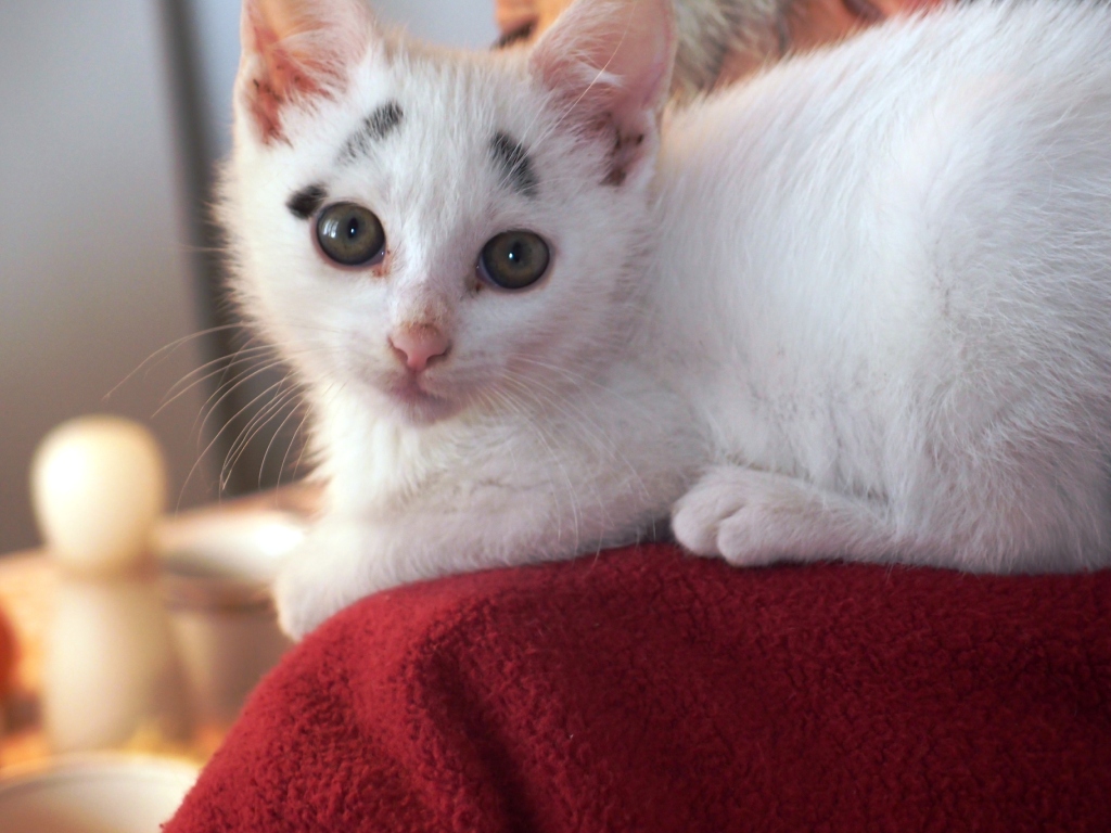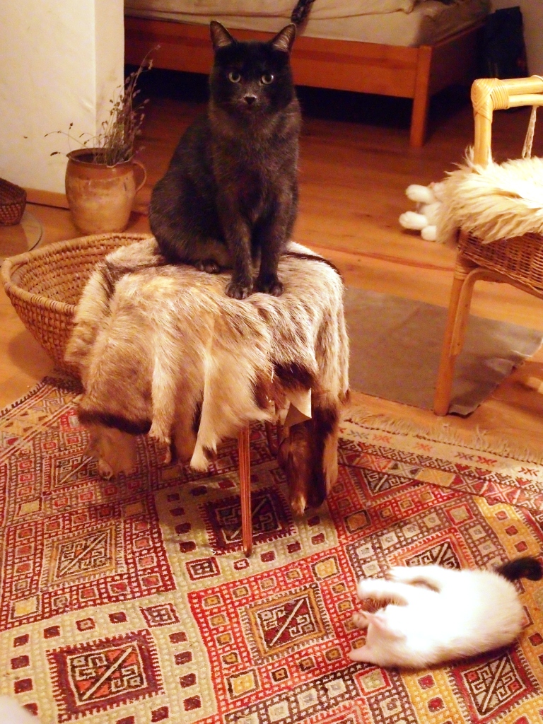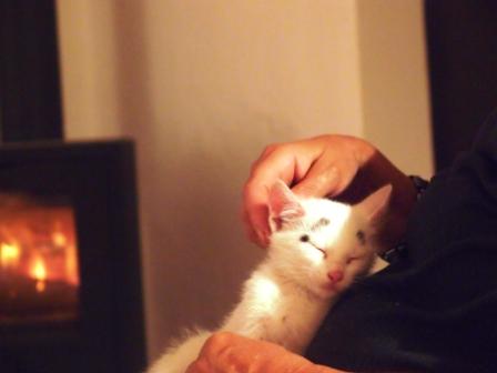 Heute hat sich Ruth, überraschenderweise, zum Kaffeebesuch angesagt. Sie fährt dafür mindestens 1 Stunde. Ich denke, dass sie nicht nur wegen des Kaffees kommt. Wahrscheinlich bringt sie was mit. Als sie mit dem Auto ankommt, hat sie in ihrem Schoß ein kleines weißes Katz. Ein flauschiger Winzling, vielleicht 2 Monate alt und ein Findling. Große dunkle Augen, mit schwarzen Strichen wie Brauen und ein schwarzes Schwänzel. Während wir in der Küche Kaffee trinken, weiß es, was es zu tun hat. Es marschiert gleich zum Katzenklo und klettert anschließend auf mich rauf. Es ist nicht klar ob es Mädchen oder Bub ist. Ich probiere viele Namen aus, von Tin-Tin, über Fidibus, zu Tilo, Django und Tschitschi. Auch Hernadreck und kleiner Furz fällt. Die schöne Tigris ist eher abweisend und faucht es an. Das Kleine lässt sich davon nicht beeindrucken und geht immer wieder auf sie zu und frisst aus ihrem Napf. Die kleine Tigris ist plötzlich die Grosse und Gesetzte. Das zweihandgroße Katz tobt herum. Es läuft und hüpft und klettert auf die Hollarin, knabbert an meinen Fingen und beiß auch mal, ist lustig und schläft im Schaffell. Schon bevor sie da waren, wusste ich, dass das Mitbringsel bleiben wird.