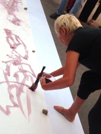 Das stille Kellergassendorf ist heute belebt mit vielen Menschen, jünger und älter, von hier und weiterher. Für die meisten sind die Objekte und Kunstprojekte in den Kellern ungewöhnlich. Medien- Videokunst, Performance gibt es zu sehen. Alles bunt. Auch die lange Tafel. Wir hören dem Glasharfenspiel zu und genießen den Wein, die Bratwürste und den Himbeerkuchen.