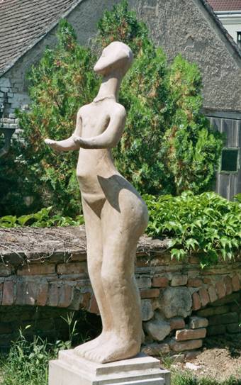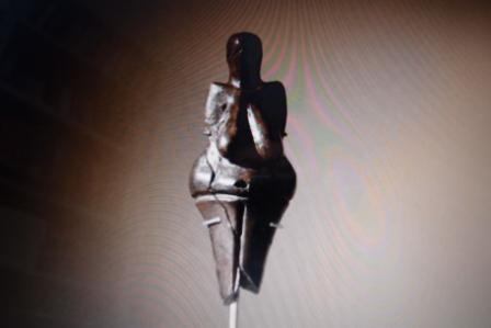 Brünn; im Mährischen Landesmuseum besuchen ich die Göttinnen des Neolothikums und die Große Mutter der Steinzeit aus Dolni Vestonice. Im Palais Ludwigstein, im Zentrum von Brünn, haben sie ihren Besichtigungsplatz erhalten. Davor am Platz ist Markt mit südhaft teurem Gemüse und Blumen. Die Archäologische Exposition zeigt Funde aus der Altsteinzeit, Jungsteinzeit, Bronze- Eisenzeit und Latinischen Zeit. Vitrinen mit den Erörterungen zu den Fundplätzen und wunderschön ockerbemalte Keramiken mit Mäandermustern und Gefäße in Bandkeramik und aus der Glockenbecher kultur. Freue mich die Göttinnen wieder zu sehen. Es fällt mir zum ersten Mal auf, dass die Frau von Hluboke Masuvki, aus der Lengyel Kultur stammend, die linke Hand mehr zu sich gerollt hat. Sie ist wegen ihrer Haltung und auch ihrer Grösse von 35,5 cm außergewöhnlich. die meisten Statuetten sind halb so groß. Diesmal kann ich ungestört fotographieren.