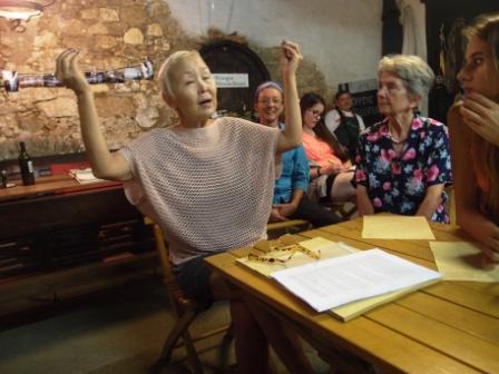 Trotzdem es ein voller Tag ist, fahren ich und Syna nach Untermarkersdorf im Weinviertel zum Worksshop von Sainkho Namtchylak. Sie erzählt von der alten Tradition des Oberton- und Kehlkopfsingen. Vor dem Buddhismus, bei dem dieses Tönen praktiziert wird, war es schon Teil der alten, schamanischen Tradition, besonders in Sibirien. Sainkho führt uns mit Atemübungen, Bewegungen der Zunge, der Arme, des ganzen Körpers und Tönen in die Kunst des Obertönen ein. Wir sind eine heterogene Gruppe von jungen bis älteren Menschen aus der Stadt und von hier und aus Tschechien. Der Weinbauer mit Familie, Studenten, Nachbarn. Ich fühle mich beglückt.