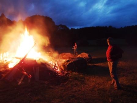Wieder drunten im Tal brennen die Sonnwendfeuer, eines beim Moorteich mit Ausschank und Schlagermusik. Ingeborg stoppt mich und ist überglücklich mitzufahren zu können, weil das Gehen schwierig für sie ist. Sie fotografiert mich bereitwillig und wir verbrennen dann beim großen Feuer was „Altes“.