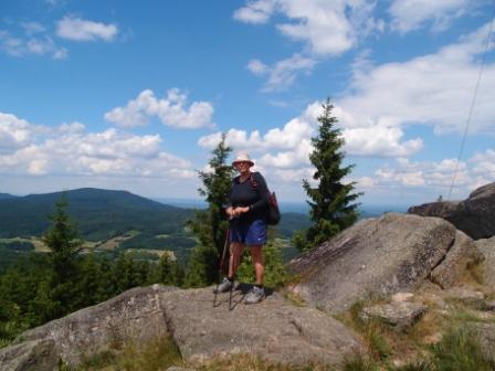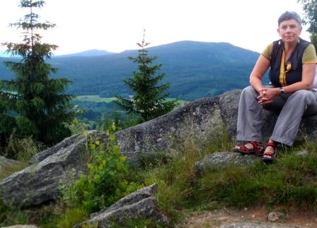 Gehe über grüne Matten mit Frauenmantel, Girsch, Glockenblumen. Margeriten, Lupinien, Fingerhüten. Rosa Schafgarbe entzückt mich. Gehen, schauen, staunen, sich orientieren. Ein Auto hält, weil ich gerade in meiner Karte schaue. Ich werde eingeladen auf den Nebelstein hinauf zu fahren. Da ich soeben erkannt hatte, dass ich zu weit von meiner Route weg bin, fahre ich ein Stück mit. Dann kraxle ich wieder weiter bergauf. In der Hütte gibt’s einen saftigen Schweinsbraten mit Waldviertlerknödel. Ich gehe zur Bergspitze mit den großen Steinblöcken, genannt drei Riesen, oder sinds Riesinnen? Weit ist der Blick. Gut hier windgeschützt zu sitzen.