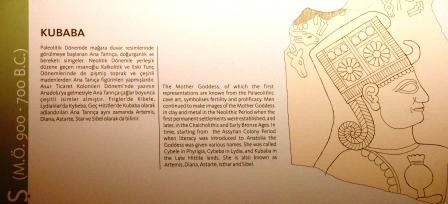 Museumstext über KUBABA: als Große Mutter bekannt im Paläolithikum, über die Jungsteinzeit und Kupfer- und Bronzezeit, die hettitische Zeit, die röm. und griech. Zeit. DiE Göttin hatte unterschiedliche Namen. Sie wurde CYBELE in Phrygia, CYBEBA in Lydia, and KUBABA bei den HettiterINnen genannt. Sie war auch bekannt als ARTEMIS, DIANA, ASTARTE, ISTHAR und SIBEL:
