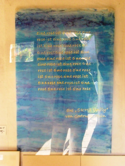 Höre Radio, Songs über Vietnam von 1969. „Fortunate Son“ von Creedence Clearwater Revival. Denke an Johannes, meinen Sohn, der in dem Jahr geboren ist und meinen Freund John, der als Gitarrist mit seiner Band die Songs von CCR geliebt und gespielt hatte. Ich schmöckere in „Die Welt ist rund“ von Gertrude Stein. Gestern habe ich das Buch antiquarisch erstanden. Die Worte daraus: „Rose ist eine Rose ist eine Rose ist eine Rose… „ zitiere ich in einem meiner Bilder. Ich erinnere mich an meine Enkelin Emelia, wie sie andächtig vor diesem Bildertext steht. Ob wir wohl dem Geheimnis dieser Textzeile auf die Spur kommen?