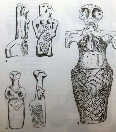 Vor Jahren, beim Besuch vom Archäologischen Museum in Budapest, bin ich auf diese Jungsteinzeitliche Statuette gestoßen. Ich nenne sie die Frau mit den großen Händen aus Tiszla in Ungarn(Theiss). Die Tiszla ist ein Nebenfluss der Donau. Mittlerweile mögen wir sie sehr und beim der Sonntagstrance (Erklärung: Die Sonntagstrance finde einmal im Monat statt, bei der trancebegeisterte Personen, in ihrem eigen Umfeld, ein Tranceritual zelebrieren) werden wir mit ihr reisen. Die Graphiken sind aus Marija Gimbutas Buch: Sprache der Göttin. Sie zeigt hier Frauen mit Netzen, die wie Schürzen oder Röcke sind, am Fluss und vielleicht fischen. Auch in Ungarn sind wir in einem großen Frauenkreis in dieser Körperhaltung schon gereist.