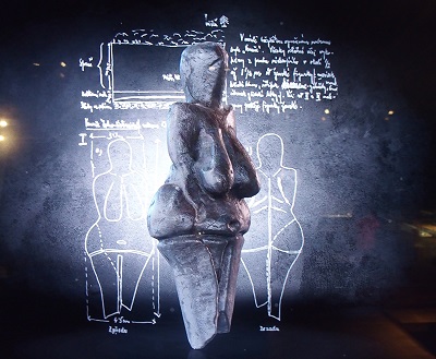 Die Statuette der Frau von Dolni Vestonice als eine, oder als die wiedergefundene erste gebrannte Frauenplastik, birgt einige geheimnissvolle Details in sich. Am Scheitel hat sie vier Vertiefungen, ihre Augen sind Schlitze, wie überhaupt der Kopf eher wie eine Haube wirkt. Der Körper ist sehr naturalistisch geformt, wie der einer Frau, die schon geboren hat, mit ausladenden Brüsten und Gesäß. Das zeigt auch der prägnante Nabel. Interessant ist die Vertiefung um die Hüften, die schon zu unterschiedlichsten Auslegungen führte. Das Foto stammt aus dem Museum Archäopark Pavlov/Tschechische Republik und dem Bericht der Findung der Statuette um 1929. Die Zeichnung aus Marija Gimbutas: Sprache der Göttin. Darauf die Linien von den Augen zu sehen, die Gimbutas die Wasser des Lebens nennt.