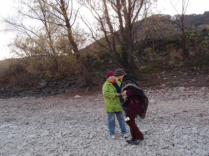 Wir freuen uns auch unserer Freundin aus Frankreich diese schöne Landschaft und Willendorf zeigen zu können.  Das lebensgroßes Abbild der Ahnfrau thront über der Donau und lädt ein sie zu betätscheln. Oberhalb der Fundstelle fertigen wir Armbänder aus Gräsern und Blüten an um diese bewusst zu haben, so wie sie die Urmutter trägt. Nach dem Ritual ist es wunderbar im Gras sitzen zu können und die Verbindung zum Boden, zur Existenz zu spüren. Wir gehen noch am Fluss entlang und die Ruhe begleitet uns und der Glanz über dem Wasser. Mit unserem Dank übergeben wir die Gräser der Donau, dem Strom der fließt und ins größere Wasser mündet. Fließen, Strömen und kreisend verbunden sein.