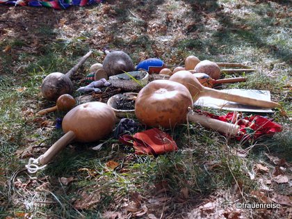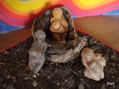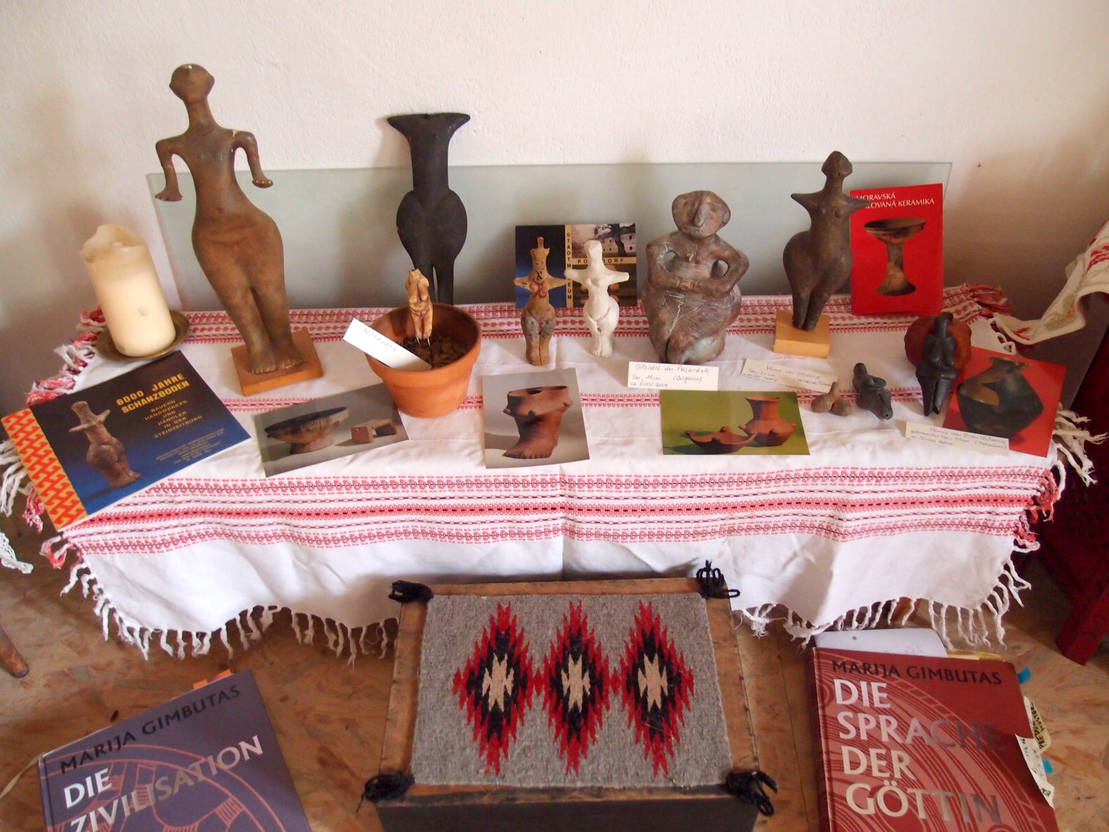 Susanne und ich bereiten den Stall vor. Es sind 16 Frauen für die Exkursion angemeldet und für die müssen wir Platz schaffen. Das Wetter ist kalt und regnerisch geworden. Ich denke mir, wenn es heute viel regnet, kann es morgen trocken sein, damit wir die Trance im Wäldchen und das Picknick machen können. Da das Schlossmuseum Jevišovicé wegen Renovierung geschlossen ist, haben wir uns ein alternatives Programm einfallen lassen. Wir machen im meinem Stall „Museum“. Wir zeigen die Fotos von der Vildomec Sammlung, die ich im Mai gerade noch machen konnte. Dazu präsentieren wir die Statuetten aus dem Neolithikum und aus dem Paläolithikum, die Susanne und ich gesammelt haben. Wir probieren den Beamer aus. Gelingt dann doch und wir sind zufrieden wie die Atmosphäre schließlich im „Stallmuseum“ ist.