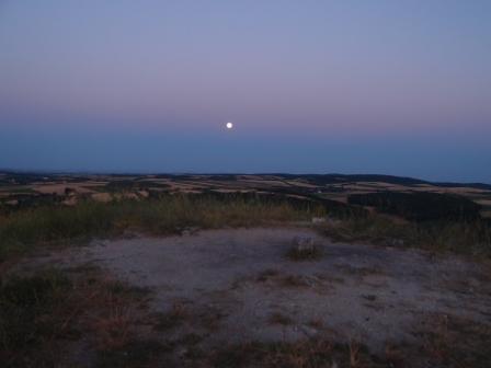 Heiss, eine Gartenbank bei meinem Lieblingstandler gekauft. Marillen gesammelt. Eingekocht. Mit Nachbarin über Königinnen und Prinzessinnen geplaudert. Dann doch auf den Berg gegangen. Grade noch die volle Sonne verschwinden und den vollen Mond aufgehen gesehen. Dabei begleiten mich hin und wieder die Klänge vom Musicalmärchen, je nach dem auf welcher Seite vom Berg ich gerade gehe. Der Weg windet sich spiralig hinauf. Die Mondin hatte sich aus dem blauen Feld ins Lila geschoben. Schaue dann bei den Proben zu. Schön die beleuchtete Bühne vor dem Berg. Amüsant. Die Teetassengräfin. Bald beginnen die Aufführungen, dann ist Festtagsstimmung im Ort. Bisschen davon schon letzten Samstag bei der Enthüllung der neuen Skulptur. Da gab es Musik, der Heurige hatte ausgeschenkt und die Reden wurden auch in Kauf genommen.
