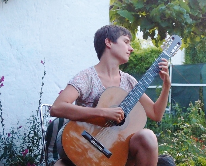 Danielle fährt mit ins Haus. Sie sitzt im kühleren Wohnzimmer und „übt“ ihre Stücke. Ich sitze im Garten und höre dem Gitarrespiel zu. Es sind wunderbare Klänge die sich durch den Garten bewegen. Fäden, Arabesken die das Herz berühren. Ein Atmen, Pulsieren, Aufnehmen. Welch ein Luxus. Ein Konzert nur für mich. Die Freundinnen sind nicht erreichbar, so bin ich alleinige Zeugin dieser unbeschreiblich schönen Klänge. Es erinnert mich an die Geschichte mit Picasso, in der ein Man einen sehnlichen Wunsch hat, und zwar ein Bild von Picasso zu erwerben. Er geht am Strand entlang, abends. Nur er ist da und in der Ferne ein Mann, der etwas in den Strand zeichnet. Ja Pablo ist es. Bis zur Flut kann er sich an dem Bild erfreuen. Ich mich jetzt an den Klängen der Gitarre. Es gibt bald eine CD mit Danielle und ihrem Spiel. Doch diese Musik direkt, jetzt, nur jetzt, in diesem Augenblich so zu erleben ist magisch.